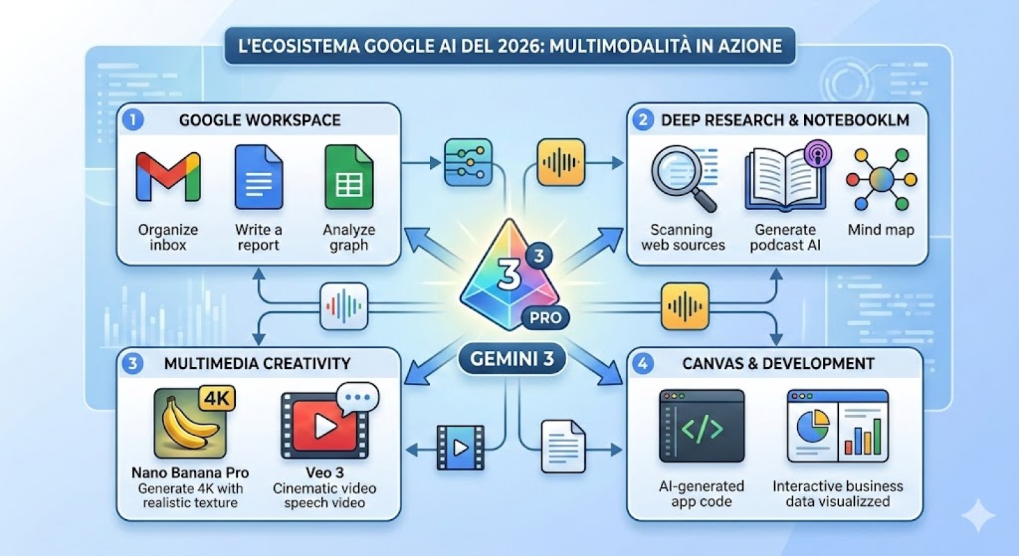 Siamo entrati in una nuova era della tecnologia. Gemini 3 Pro non è più una collezione di strumenti separati, ma il cuore pulsante di un ecosistema dove ogni applicazione comunica fluidamente con le altre. Ecco come Google AI ha trasformato il nostro modo di lavorare, creare e vivere.